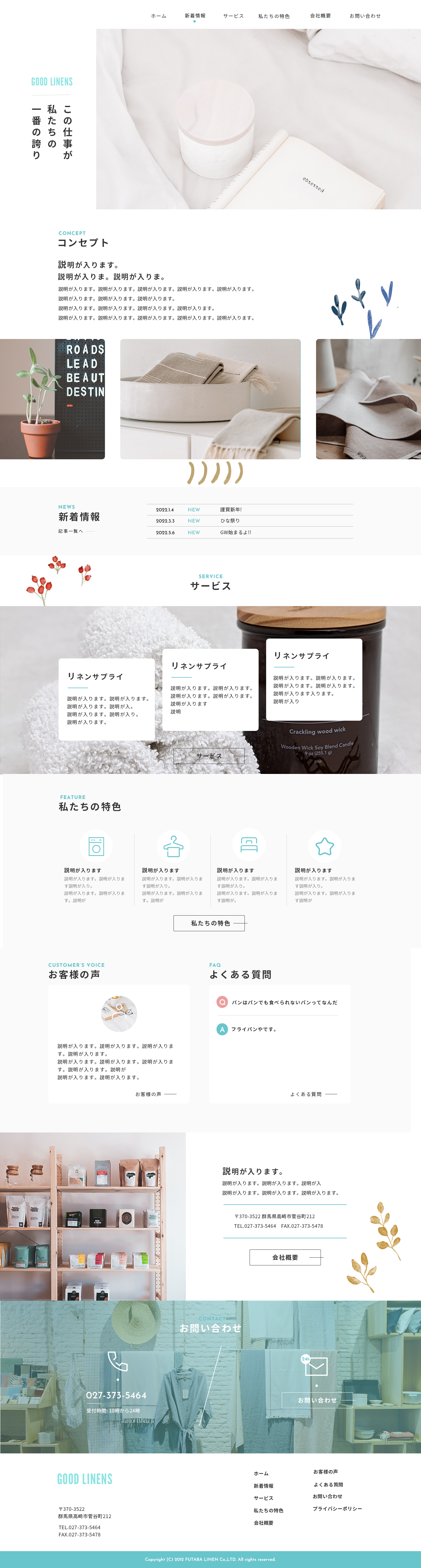 リネンを扱っている企業様(GOOD LINENSは架空の企業様の名前です)のサイトのため清潔感があるデザインにいたしました。またこちらの企業様は歴史の古いながらも新しいことにも挑戦していくという理念があり、きっちりとしながらも若々しく、賑やかなイメージでサイトを組ませていただきました。