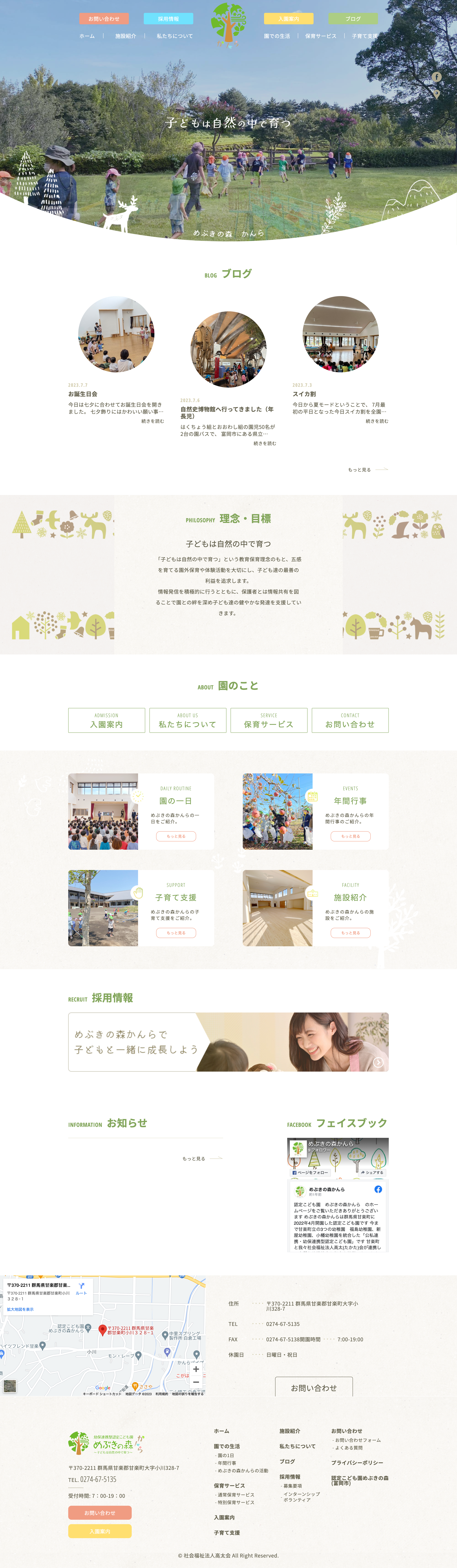 園舎のイメージに合うその場にいるかのような温かいデザインと群馬県甘楽町の自然を意識し、シンプルな配置を心がけました。コーディングではwordpressを使用し、一からテーマを作成いたしました。